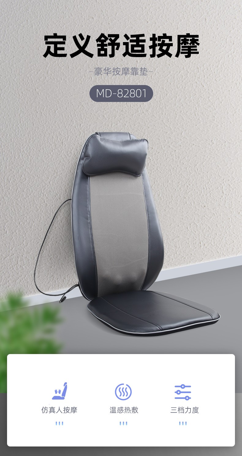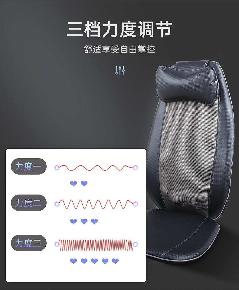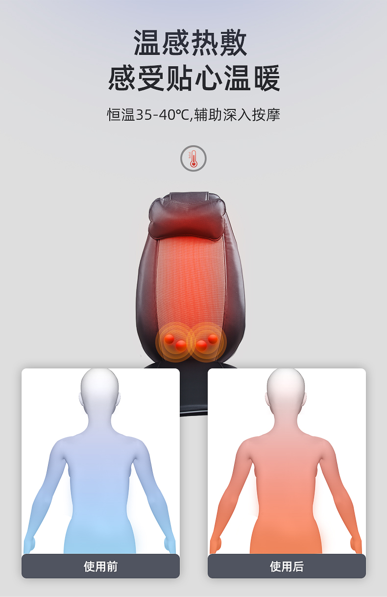 背部揉捏功能,三檔按摩力度可供選擇,背部定點按摩