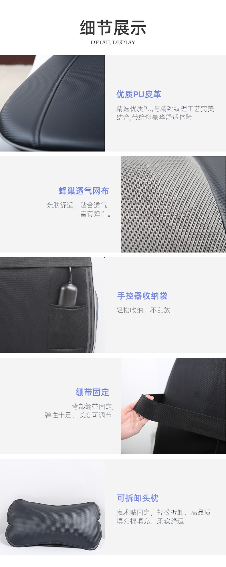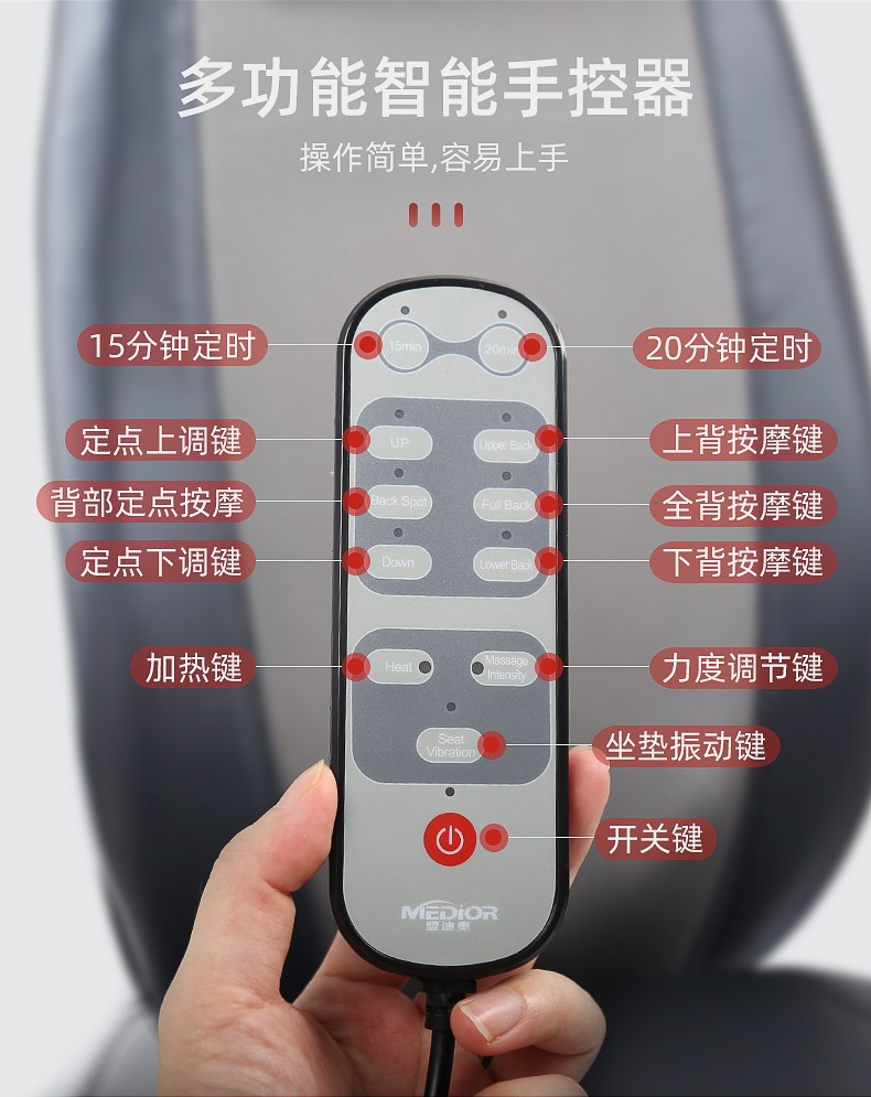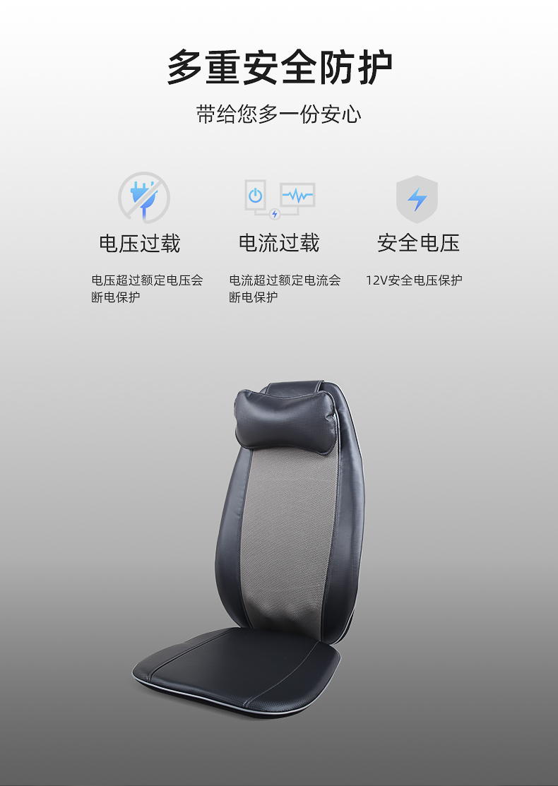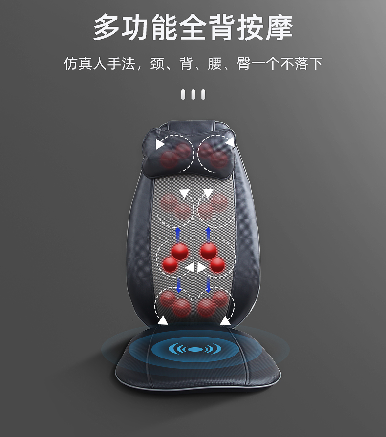 背部揉捏功能,三檔按摩力度可供選擇,背部定點按摩
